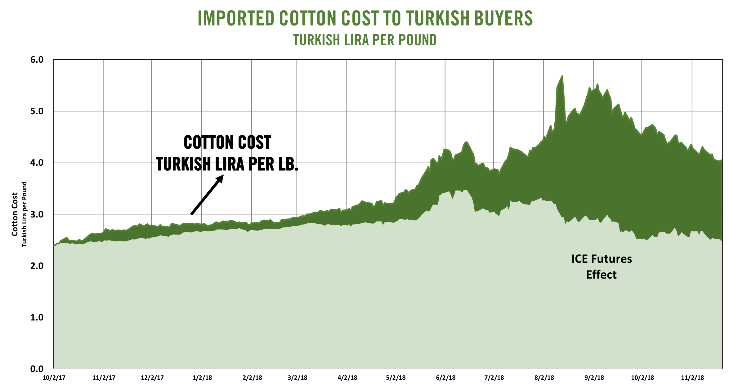 A perfect example is Turkey, a reliable customer for many years. A deepening economic crisis in Turkey caused its currency, the Lira (TRY), to plummet. From April 2 to August 13, the Lira fell almost 73 percent in value versus the U.S. dollar. Since textile mills in Turkey must buy dollars in order to purchase U.S. cotton, mills that would have normally imported U.S. cotton were forced to focus on domestically-grown cotton, which does not require exchanging currency. However, Turkey’s farmers only produce about 63 percent of cotton needed by the country’s textile industry, thus mills eventually will have to import cotton to meet their needs. Fortunately, the Turkish Lira has partially recovered since August as economic and political tensions eased, putting U.S. cotton back in reach of Turkish buyers.