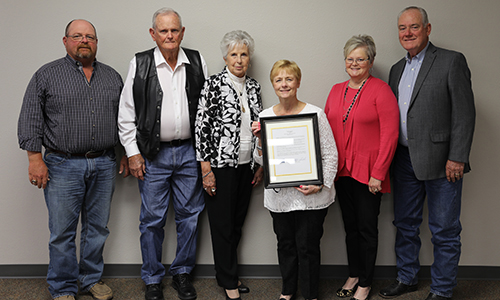 Larry Williams’ family pictured with resolution honoring his service to the industry. From left to right: Wes Williams, Herbert and Mary Kerby Williams, Virginia Williams and Nancy and Daylon Althoff.