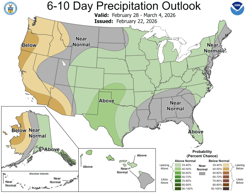 Overall, the week looks lighter on major data releases but still heavy on policy headlines. Markets will likely take their cues from macro developments and trade policy direction, with President Trump’s State of the Union address on Tuesday, the 24th, likely to draw particular attention for any signals on trade, economic policy, and the broader outlook. Additionally, attention will also continue to gradually shift toward spring planting expectations.