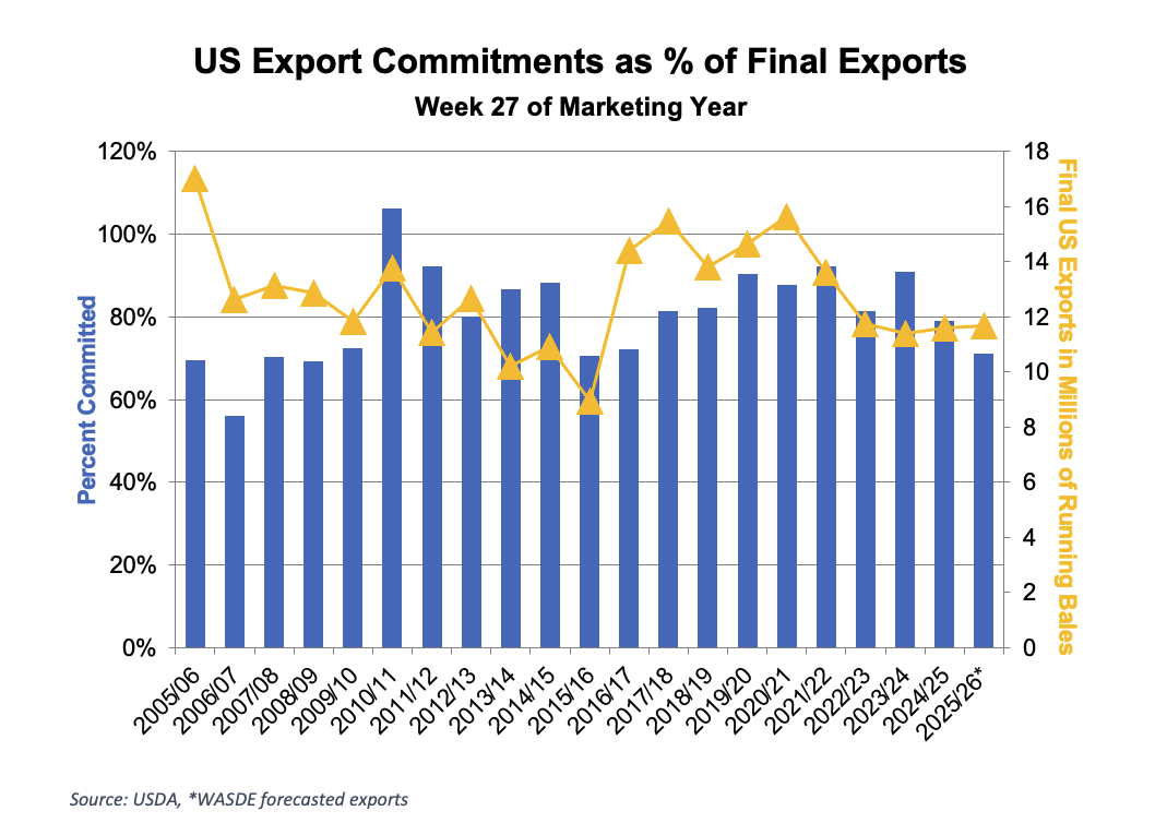 - Updated supply and demand estimates were released this past week, and the report leaned neutral to slightly bearish overall. On the U.S. side, the balance sheet was largely unchanged aside from a modest reduction in exports. U.S. exports were lowered 200,000 bales to 12 million bales, which was not unexpected given the pace of sales and shipments this season. With no other adjustments, ending stocks increased 200,000 bales to 4.4 million bales. The stocks-to-use ratio moved up to 32.4%, a level that continues to suggest price pressure rather than support.