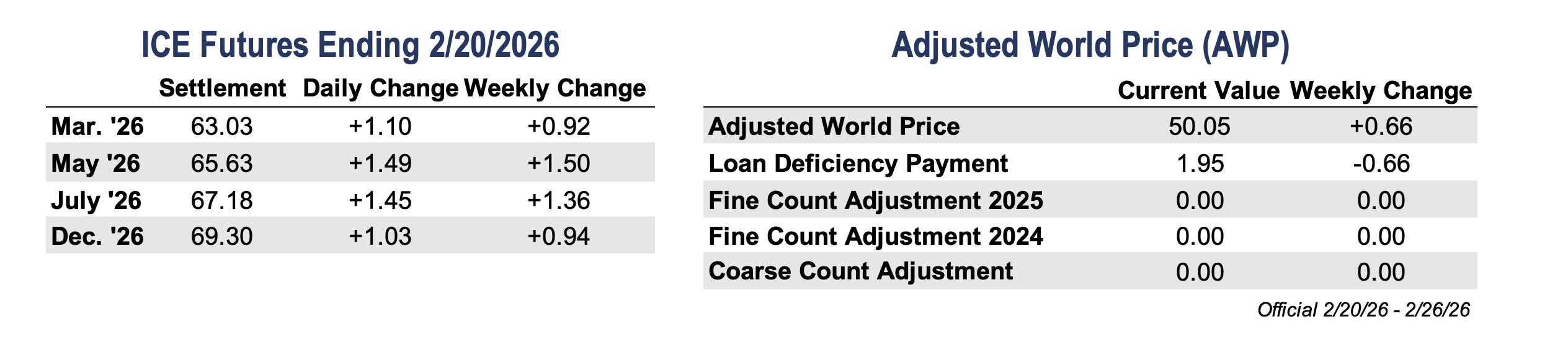 - First Notice Day for the March contract is today, February 23, shifting the market’s focus fully to the May contract, which posted another week of solid gains. May rose 150 points on the week to close at 65.63 cents.