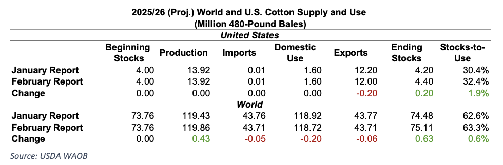 - Globally, changes were also relatively small but leaned bearish. World production increased 430,000 bales to 119.86 million bales, driven primarily by a higher crop estimate for China. World consumption was reduced 200,000 bales to 118.72 million bales, and as a result, global ending stocks rose 630,000 bales to 75.11 million bales. Several key importing countries also trimmed their import projections, reinforcing the slightly softer tone of the report.
