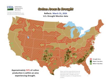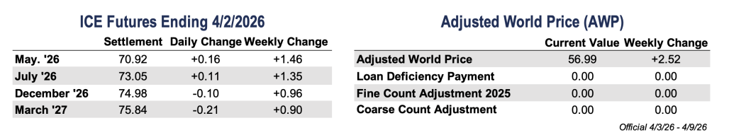 - USDA’s Prospective Plantings report showed 9.64 million acres for the 2026 crop, at the higher end of expectations and up roughly 4% from last year’s 9.28 million acres. The increase was largely driven by the Southwest, with Texas estimated at 5.52 million acres, Oklahoma at 450,000, and Kansas at 100,000. The figure came in above both the National Cotton Council’s 8.99 million acres and USDA’s February Ag Outlook of 9.4 million. While the report leaned bearish on the surface, uncertainty around final acreage remains, given ongoing drought concerns and volatility in input costs during the survey period.