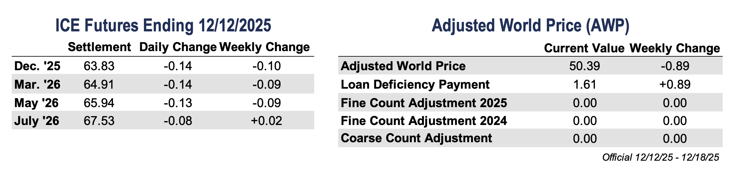 • Cotton-specific news remained limited, with much of the focus on shutdown-delayed reports still working their way through the system. Export Sales were mixed, and the December supply and demand report was largely taken in stride. Futures took little direction from outside markets despite a 25-basis-point Fed rate cut that supported equities, as cotton remained weighed down by steady selling. The tone stayed subdued throughout the week, with technicals still pointing to limited upside momentum. In a switch, speculators were net buyers for five consecutive weeks through November 18 based on the latest available data, which was delayed by the government shutdown, even as the market posted a contract low.