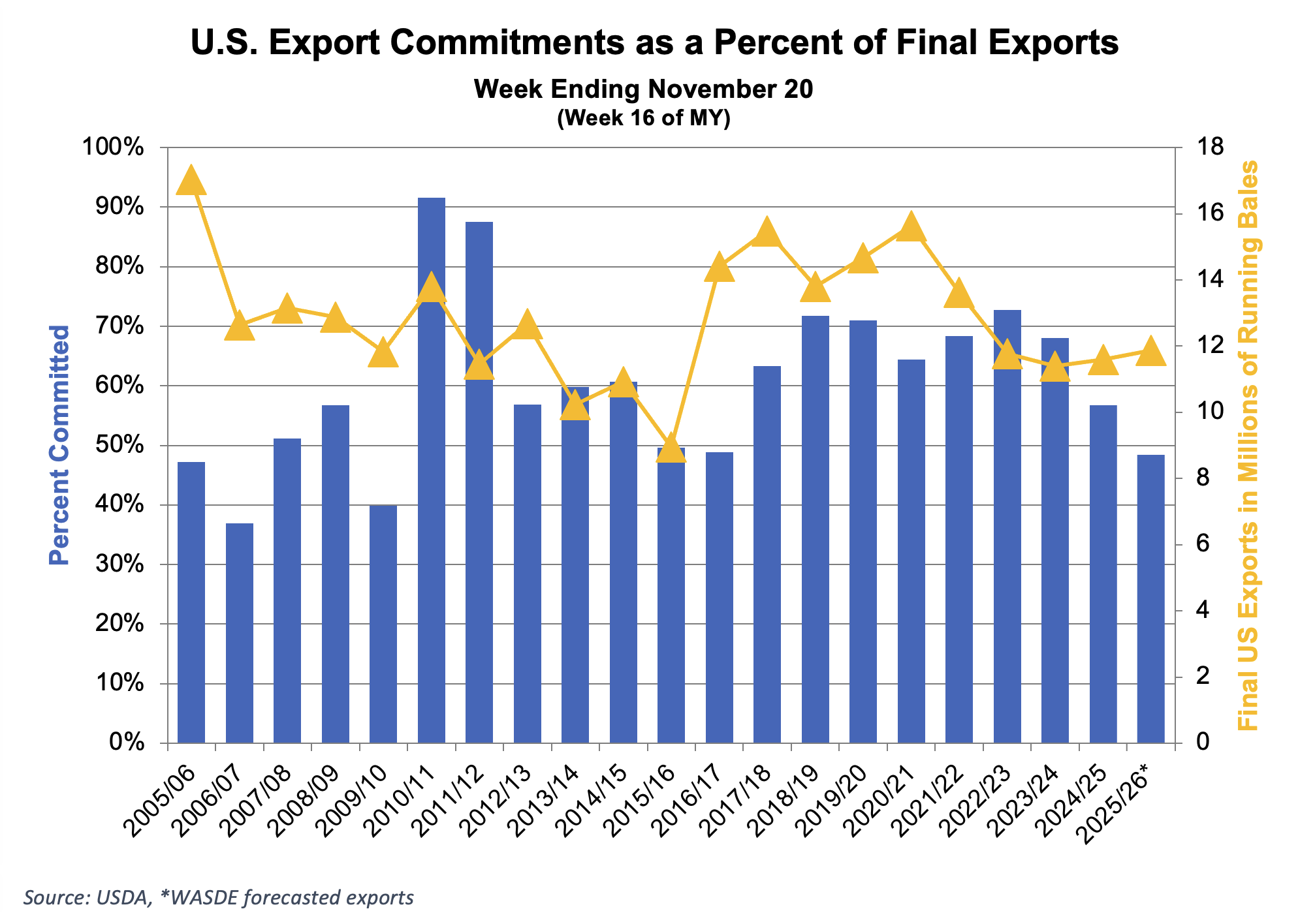 • The following week, ending November 20, net Upland sales eased to 148,400 bales, while shipments increased to 120,800 bales. Vietnam, Turkey, and Pakistan once again led weekly buying. Pima net sales came in at 6,200 bales, with shipments at 6,700 bales. Even so, total commitments and shipments remain behind the pace needed to reach USDA’s export projection of 12.2 million bales. USDA is still working through data delays tied to the government shutdown but is expected to be fully caught up with the Export Sales Report on January 8.