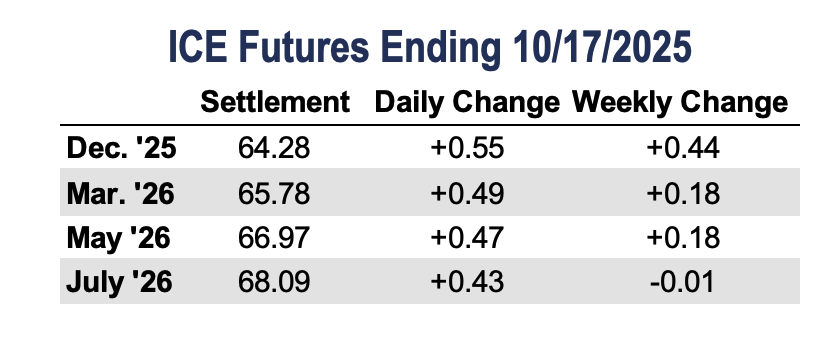 - Cotton futures saw a modest rebound last week after President Trump suggested in an interview that tariffs on China were “not sustainable.” Trade tensions remain elevated, but upcoming meetings could help clarify the outlook before the November 1 tariff implementation. December futures ended 44 points higher at 64.28, offering brief relief but little change to the bigger picture.