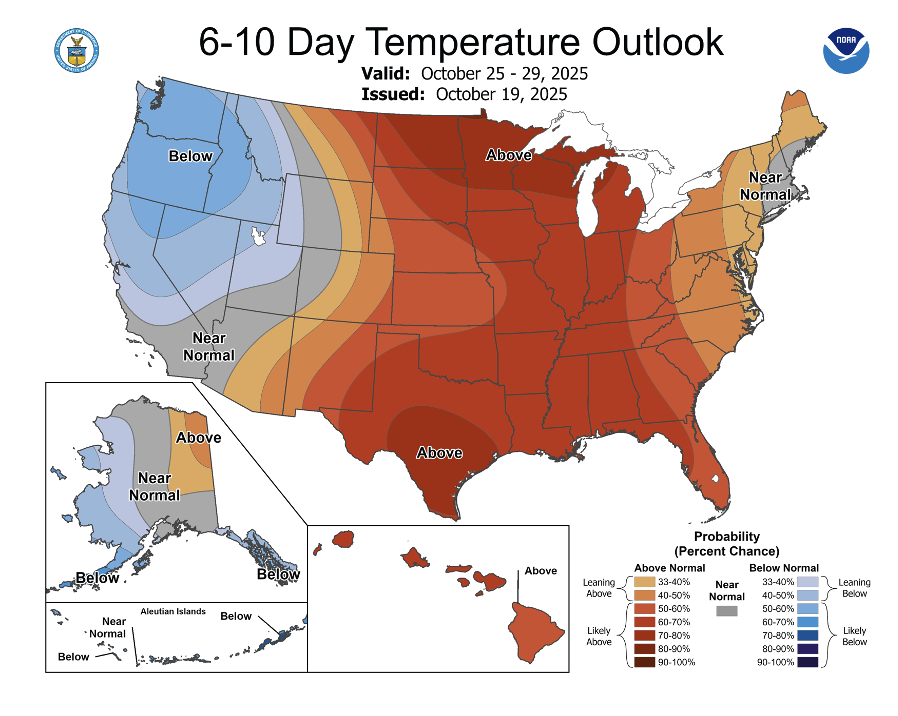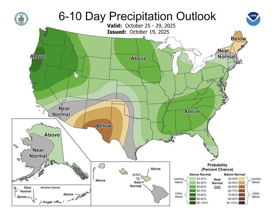- Harvest is in full swing across the Southwest and moved along well last week before light weekend rain briefly slowed activity in parts of West Texas and southwestern Oklahoma. Totals were minimal, and conditions quickly improved, keeping overall progress on track. The next two weeks look mostly dry and favorable, with only a few light showers late this week that could cause short interruptions. Temperatures will swing between the 70s and 90s, briefly cooler late week before warming again early next week — overall, a supportive pattern for harvest.