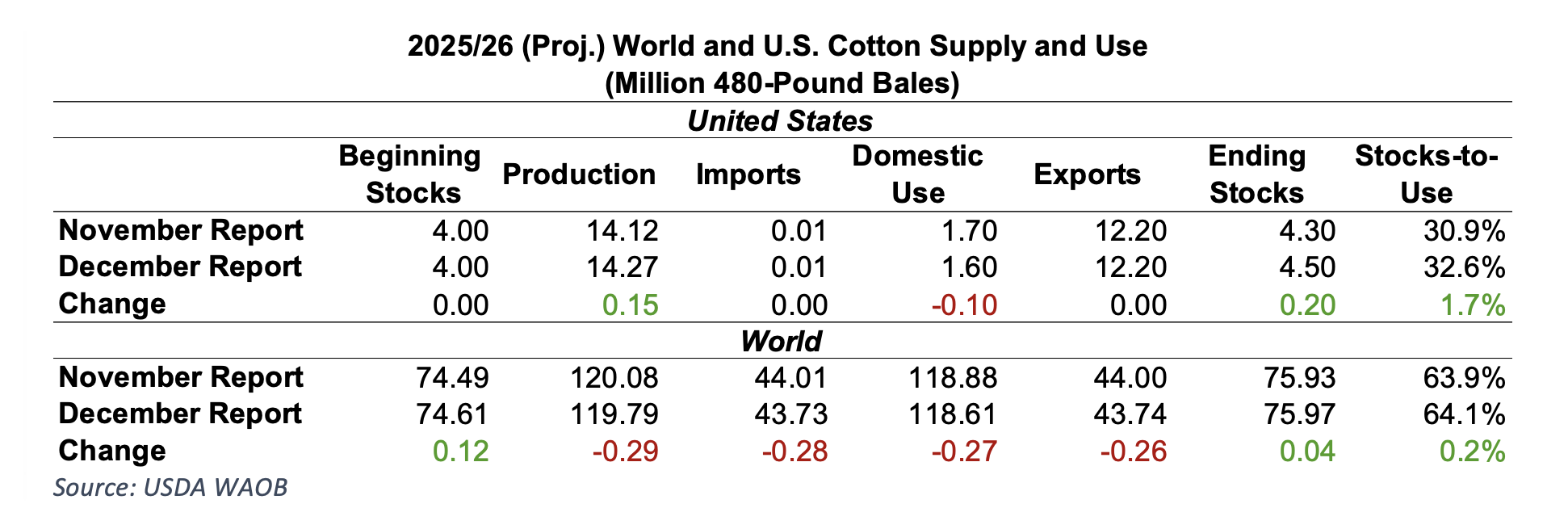 - The December World Agricultural Supply and Demand Estimates (WASDE) was greeted with a yawn. While most agreed with the overall balance sheet, analysts strongly disagreed with the regional production estimates. U.S. production was increased to 14.27 million bales, driven by gains in the Mid-South and Southeast, while the Southwest saw a net decline. Texas production was reduced by 300,000 bales to 5 million, Oklahoma fell 20,000 bales to 450,000, and Kansas remained unchanged at 150,000 bales. U.S. domestic consumption was also lowered by 100,000 bales to 1.6 million bales, while exports were left unchanged at 12.2 million bales, pushing ending stocks higher to 4.5 million bales and keeping them elevated.